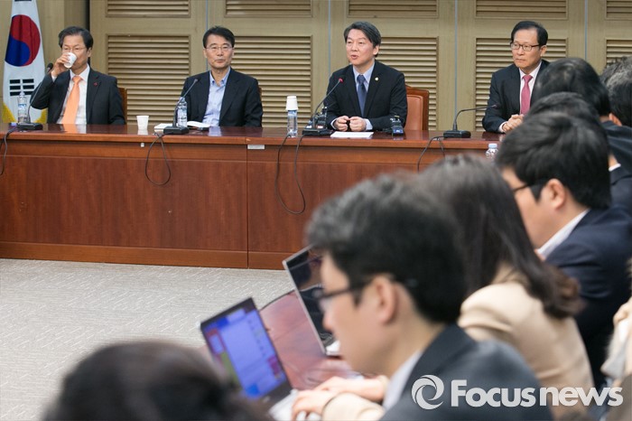 (서울=포커스뉴스) 안철수(뒷줄 오른쪽 두번째) 국민의당 인재영입위원장이 1일 오전 서울 여의도 국회 의원회관에서 열린 '안철수·장하성 경제토크'에 참석해 발언하고 있다.