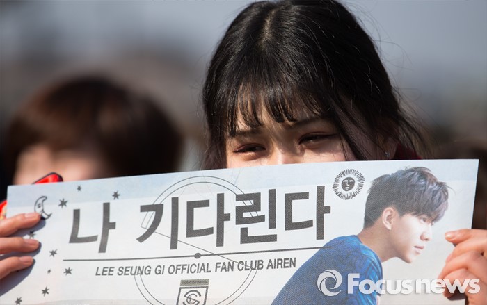 (논산=포커스뉴스) 1일 오후 충남 논산 육군훈련소 앞에서 가수 겸 배우 이승기의 팬들이 응원 문구가 적힌 현수막을 들고 입소를 기다리고 있다.