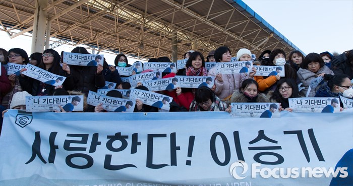 (논산=포커스뉴스) 1일 오후 충남 논산 육군훈련소 앞에서 가수 겸 배우 이승기의 팬들이 응원 문구가 적힌 현수막을 들고 입소를 기다리고 있다.