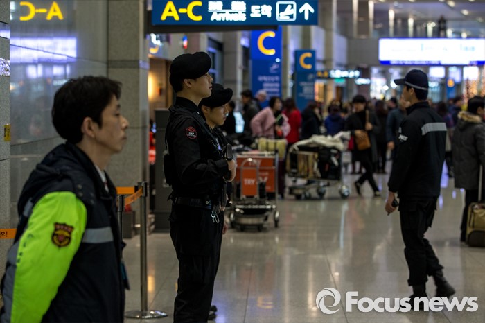 (인천공항=포커스뉴스) 인천국제공항에 폭발물 의심 물체와 함께 아랍어로 된 협박성 메모가 발견된 사건 수사가 진행되고 있는 1일 오후 폭발물 의심 물체가 발견된 인천공항 입국장 화장실에서 경찰병력이 경계 근무를 서고 있다.