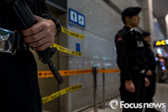 (인천공항=포커스뉴스) 인천국제공항에 폭발물 의심 물체와 함께 아랍어로 된 협박성 메모가 발견된 사건 수사가 진행되고 있는 1일 오후 폭발물 의심 물체가 발견된 인천공항 입국장 화장실에서 경찰병력이 경계 근무를 서고 있다.