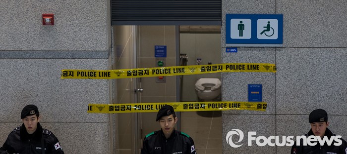 (인천공항=포커스뉴스) 인천국제공항에 폭발물 의심 물체와 함께 아랍어로 된 협박성 메모가 발견된 사건 수사가 진행되고 있는 1일 오후 폭발물 의심 물체가 발견된 인천공항 입국장 화장실에서 경찰병력이 경계 근무를 서고 있다.
