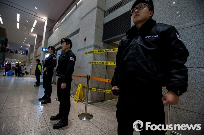 (인천공항=포커스뉴스) 인천국제공항에 폭발물 의심 물체와 함께 아랍어로 된 협박성 메모가 발견된 사건 수사가 진행되고 있는 1일 오후 폭발물 의심 물체가 발견된 인천공항 입국장 화장실에서 경찰병력이 경계 근무를 서고 있다.