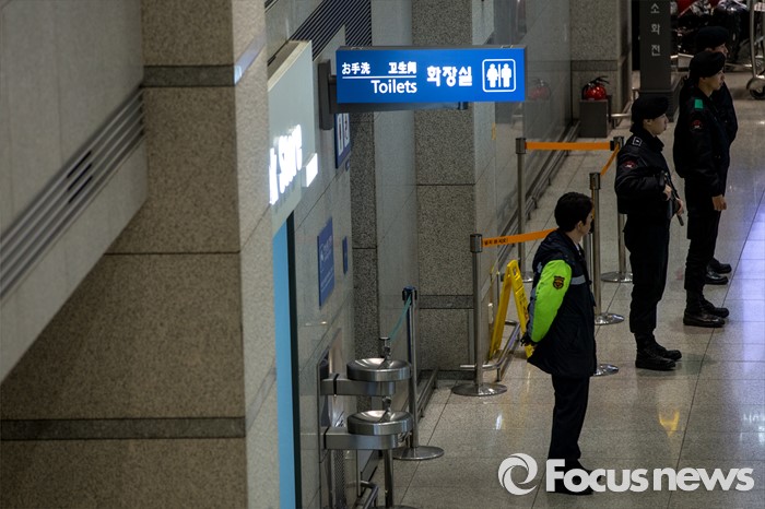 (인천공항=포커스뉴스) 인천국제공항에 폭발물 의심 물체와 함께 아랍어로 된 협박성 메모가 발견된 사건 수사가 진행되고 있는 1일 오후 폭발물 의심 물체가 발견된 인천공항 입국장 화장실에서 경찰병력이 경계 근무를 서고 있다.