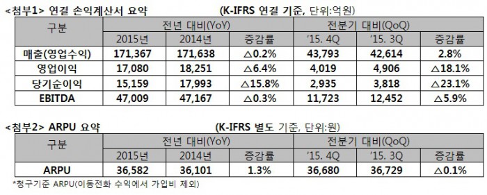 황근주 SK텔레콤 전략기획부문장은 “지난해는 통신산업 정체와 가입자 포화 등 경기 불확실성 속에서 신(新)성장동력 확보에 주력한 한 해였다”며 “올해는 통신을 기반으로 새로운 고객가치를 창출하는 차세대 플랫폼 사업 분야에서 가시적 성과창출을 주도해 나갈 것”이라고 밝혔다.SK텔레콤의 2015년 실적 설명표.<표제공=SK텔레콤>