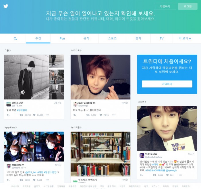 이에 따라 트위터 홈페이지에 비로그인 이용자들이 접속하면 이제 뉴스, 스포츠, 음악, 연예 등의 카테고리별로 인기 트윗을 볼 수 있다. 기존에는 간단한 서비스 소개 문구와 함께 로그인 및 회원가입 버튼, 몇몇 이용자의 트윗에서 연결된 배경 사진만이 노출됐다.