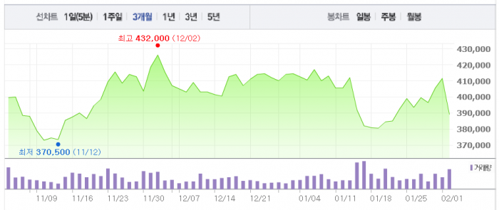 박신애 대신증권 연구원도 4분기 매출은 "흠잡을 데 없는 성장세"라며 150억 원의 성과급을 지급하지 않았다면 영업이익은 예상대로 나왔을 것이라는 분석이다. 견조한 성장세를 감안하면 일시적인 주가조정은 매수기회라는 설명이다.아모레퍼시픽은 전일 4분기 실적 실망감으로 5.4% 급락했다. (자료제공=네이버금융)