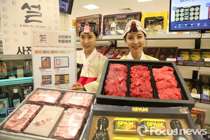 최훈학 마케팅 팀장은 “명절 막바지 직접 구매해 전달하는 개인 수요가 늘어 휴대가 편리하고 가격이 저렴한 신선 실속세트의 진열을 확대했다”며 “올해는 고가 위주의 축산 세트도 6만원짜리 횡성한우보신세트, 7만8000원짜리 등 10만원 미만의 세트 물량을 늘려 소비자들이 더욱 다양한 선택을 할 수 있도록 했다” 고 말했다.2015년 12월28일 오전 서울 한강로 이마트 용산점에서 설 선물세트 사전예약 판매가 진행 중인 가운데 모델들이 다양한 선물세트를 선보이고 있다.<사진제공=이마트> 2016.01.10 이서우 기자