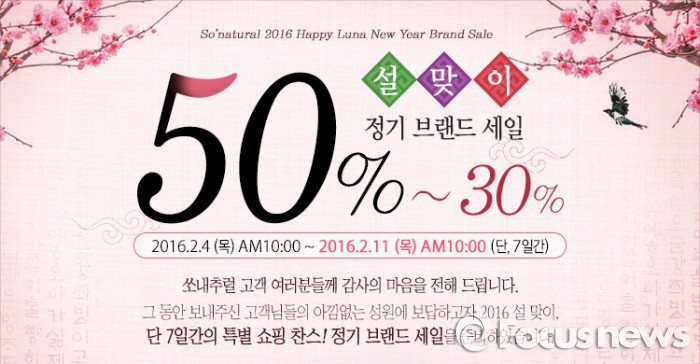 (서울=포커스뉴스) 쏘내추럴은 설을 맞아 홈페이지와 모바일 숍을 통해 오는 11일 오전 10시까지 정기 브랜드 세일을 진행한다.