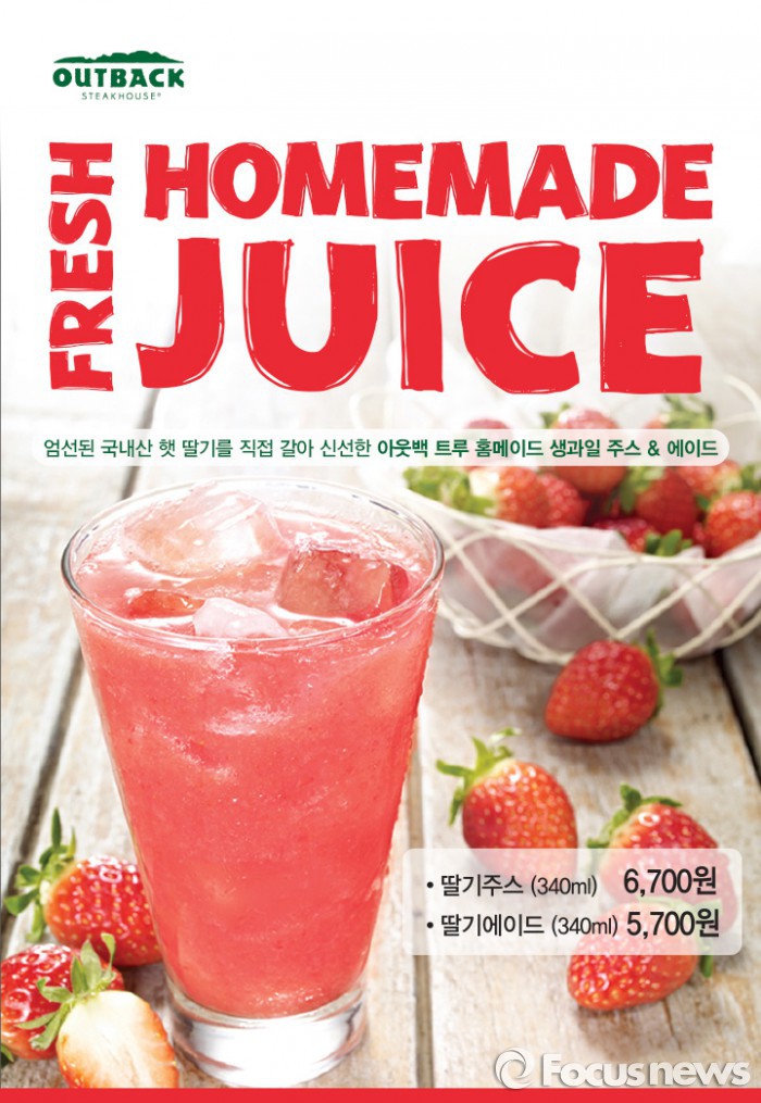 (서울=포커스뉴스) 아웃백 스테이크하우스(이하 아웃백)는 제철 딸기를 직접 갈아 만든 ‘아웃백 생과일 홈메이드 딸기주스’를 11일 선보였다.