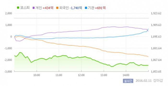이날 코스피는 전거래일 대비 2.35% 하락한 1872.68에 장을 시작했다. 이후 지수는 가파르게 하락하며 장중 1860선 아래로 밀려나기도 했다.