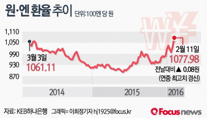 정경팔 하나선물 시장분석팀장은 "위험회피에 따른 엔캐리 트레이드 청산이 진행됨과 동시에 미 연준이 올해 금리를 인상하지 않을 수도 있다는 기대도 반영되고 있다"고 설명했다.(서울=포커스뉴스) 최근 엔화 가치가 초강세를 보이고 있다. 12일 오후 3시 KEB하나은행이 고시한 원·엔 재정환율은 100엔당 1077.98원으로 전 거래일보다 0.01%(0.08원)상승했다. 이는 연중 최고치였던 11일 1077.90원을 경신한 금액이다. 원·엔 재정환율이 100엔당 1060원을 넘어선 것은 지난 2014년 3월3일(1061.11원) 이후 1년11개월 만에 처음이다.2016.02.12 이희정 기자