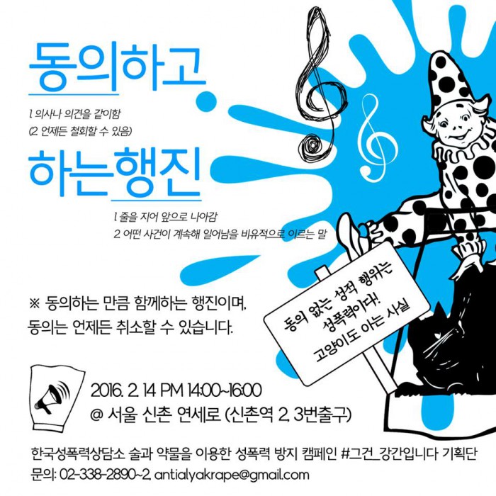 ‘한국성폭력상담소 술과 약물을 이용한 성폭력 방지 캠페인 #그건_강간입니다 기획단’은 이날 오후 2시부터 신촌역 일대 연세로 ‘차 없는 거리’에서 술, 약물 등에 취해 동의하지 않은 상태에서 이뤄지는 성적 행위를 규탄하기 위해 ‘동의하고 하는 행진’을 진행했다.