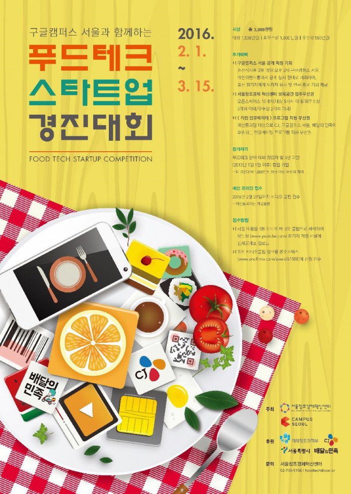 미래창조과학부, CJ, 서울특별시, 배달의 민족이 후원하는 이번 행사는 푸드테크분야 예비창업자 및 3년 미만 창업 기업을 대상으로 하며, 구글캠퍼스와 함께하는 푸드테크 스타트업 경진대회(http://onoffmix.com/event/61588)로 오는 29일까지 1분 이내의 사업소개 동영상 클립과 함께 접수하면 된다.푸드테크 스타트업 경진대회 포스터.<사진=서울창조경제혁신센터 홈페이지>