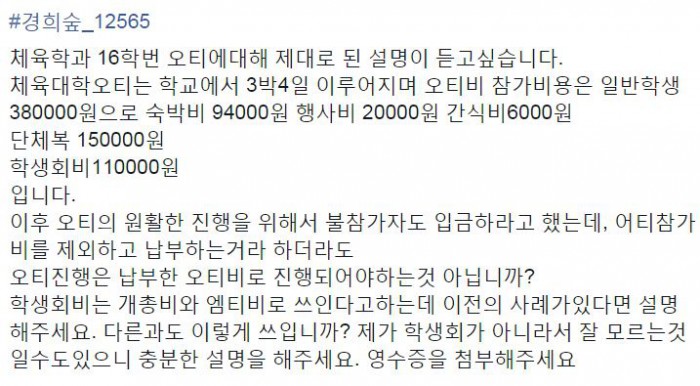(서울=포커스뉴스) 경희대학교 체육대학이 신입생 오리엔테이션(OT) 참가비를 지나치게 많이 걷는다며 한 학생이 해명을 요구해 논란이 되고 있다.