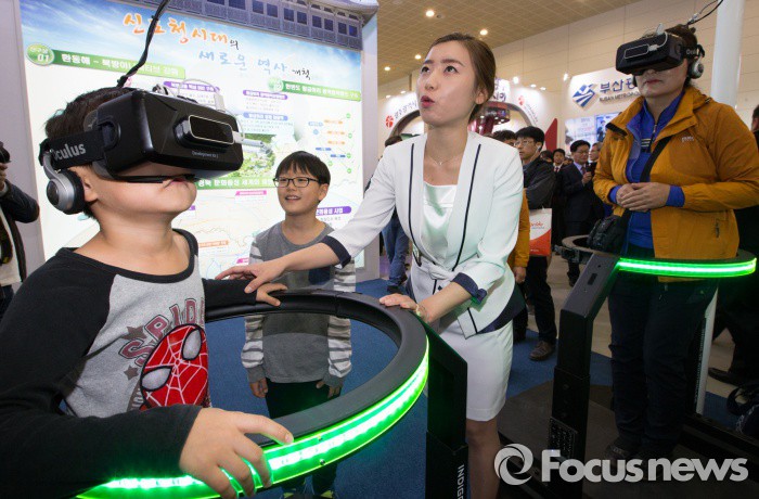 미래부 관계자는 "정부와 민간이 협력해 시장 초기 단계인 VR 산업을 선점하도록 적극적으로 지원할 것"이라며 "나아가 전 세계가 열광하는 문화‧한류콘텐츠 확산을 위해 문체부 등 관계부처와 협업하겠다"고 밝혔다.(세종=포커스뉴스) 29일 오전 세종시 다솜3로 정부세종컨벤션센터에서 열린 제3회 대한민국 지방자치박람회 경상북도 정책홍보관에서 관람객들이 HMD Gear VR을 체험을 하고 있다.HMD(Head Mounted Display)는 안경처럼 머리에 스고 대형 영상을 즐길 수 있는 영상표시장치이며 Gear VR은 삼성이 미국 오클루스사와 손잡고 개발한 최신의 HMD 기기로 삼성 갤럭시 폰을 이용해 가장 완벽한 가상현실 체험을 간편하게 즐길 수 있는 기기다.2015.10.29 김기태 기자