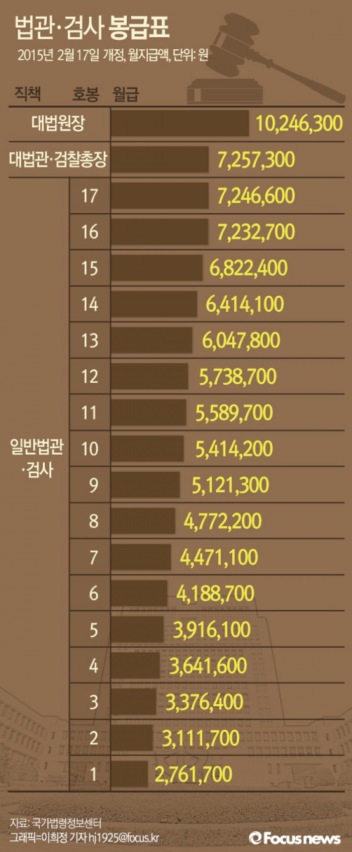 일반법관과 검사의 경우 1~17호봉으로 구분해 봉급을 받는다.