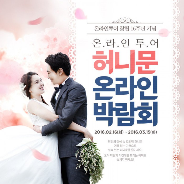 온라인투어의 허니문 온라인 박람회는 다음달 15일까지 열린다. 온라인투어측은 "웨딩업체를 거치지 않아 중간마진없이 경제적인 가격이 온라인투어 허니문의 큰 강점이다. 앞으로도 거품은 빼고 혜택은 더한 허니문 여행으로 신혼부부들의 새로운 출발을 응원하겠다"고 말했다.온라인투어가 여는 '허니문 온라인 박람회' 포스터. <사진제공=온라인투어>