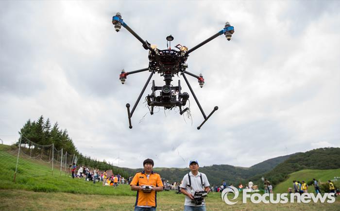 국토부는 “이번 비행이 국내 드론산업 발전의 씨앗이 될 것”이라면서 “시범사업을 내실 있게 추진하고 관련 규제도 단계별로 발 빠르게 정비해 산업계의 드론 신 산업 상용화 계획을 적극 지원하겠다”고 밝혔다.(평창=포커스뉴스) 12일 오후 강원도 평창군 대관령 삼양목장에서 열린 '2015 대한민국 드론의 날'에서 드론이 비행을 하고 있다. 2015.09.12 강진형 기자