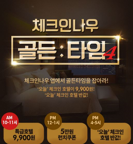 '골든타임 4' 이벤트는 하루에 3번 정해진 시간(오전 10시, 오후 12시, 오후 4시)에 호텔 9900원 숙박권과 모바일 할인쿠폰 증정, 호텔 반값 할인 등의 혜택을 제공하는 내용이다. 이벤트 참여는 체크인나우 앱을 통해서 가능하다.
