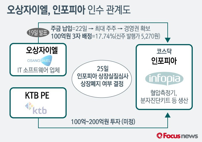한편, 정보기술(IT) 업체인 오상자이엘은 이날 인포피아의 100억원 규모의 제3자 배정 유상증자에 참여해 증자 대금을 납입한 것으로 알려졌다.(서울=포커스뉴스) 21일 증권업계에 따르면 오상자이엘은 지난 19일 공시를 통해 의료용품 사업을 하는 인포피아의 유상증자에 참여해 추후 경영권을 인수한다고 밝혔다. 오상자이엘은 제3자배정 유상증자 참여 방식으로 인포피아 주식 189만7534주(17.74%)를 취득할 계획이다. KTB PE는 인포피아의 유상증자 참여와 관련, "인포피아 정상화가 모든 투자의 선결 조건"이라며 "종합적인 실사를 통해 추후 결정할 일"이라고 설명했다. 현 시점에서 KTB의 참여 여부는 불확실하다.2016.02.22 김일환 기자 (서울=포커스뉴스) 21일 증권 및 기업인수합병(M&A) 업계에 따르면 지난 19일 오상자이엘은 헬스케어 사업 진출을 위해 인포피아 지분 17.74%(189만7534주)를 취득한다고 공시했다. 3자배정 방식으로 총 100억원 규모다. 그러나 오상자이엘이 인포피아 인수 관련 유상증자에 사용하는 100억원대 자금의 출처에 의혹이 제기되고 있다. 일각에선 지난해 중소기업 육성차원에서 지원된 한국투자파트너스의 공공 성격 펀드 자금을 오상자이엘이 부당하게 전용하고 있는 것이 아니냐는 의심을 사고 있다. 2016.02.22 김일환 기자