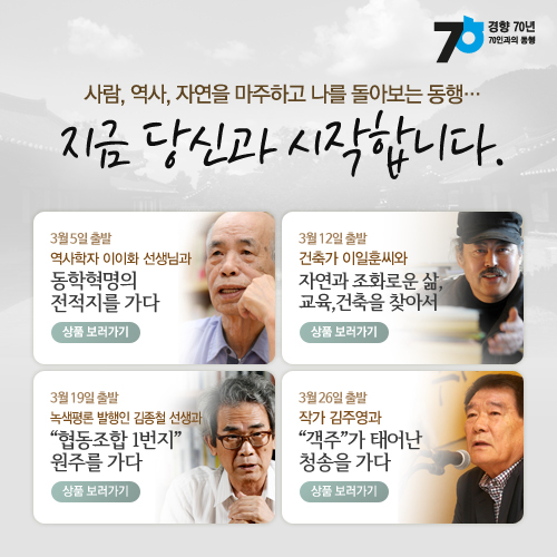 '4인4색 저명인사와의 동행'은 역사학자 이이화, 건축가 이일훈, 녹생평론 발행인 김종철, 작가 김주영 등 저명인사 4명과 함께 대한민국 방방곡곡의 숨결을 찾아 떠나는 상품이다. △역사학자 이이화의 '동학혁명의 격전지를 가다'(3월5일) △건축가 이일훈의 '자연과 조화로운 삶, 교육, 건축을 찾아서'(3월12일) △녹색평론 발행인 김종철의 ''협동조합 1번지' 원주를 가다'(3월19일) △작가 김주영의 ''객주'가 태어난 청송을 가다'(3월26일) 등 총 4가지 테마로 구성돼 있다. 가격은 3만9000원부터 4만4000원까지다.