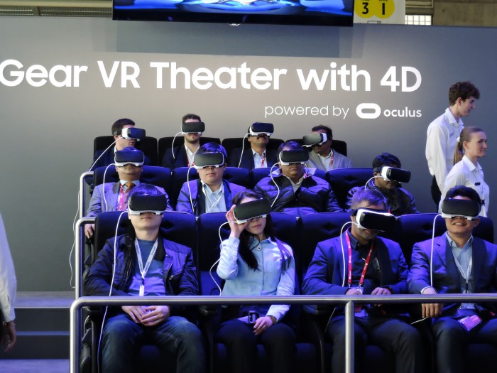 모바일 전시장에 난데없는 비명이 울려 퍼졌다. 무슨 일인지 궁금해 하는 사람들의 눈길이 그곳으로 쏠렸다. 삼성이 22일(현지시간)부터 스페인 바르셀로나에서 열리고 있는 모바일월드콩그레스(MWC) 전시장 입구에 만든 거대한 가상현실 체험 기구다. 30명 남짓한 사람들은 기구에 올라탄 채 기어VR(가상현실)을 쓰고 롤러코스터 탑승 체험을 했다. 롤러코스터가 끝까지 올라갔다가 땅바닥으로 곤두박질 칠 때마다 사람들은 탄성을 질렀다.