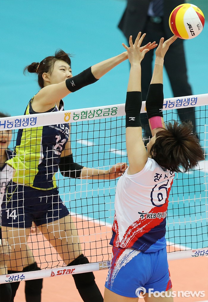 KGC인삼공사는 외국인선수 헤일리가 20득점으로 분전한 가운데 백목화가 12득점으로 힘을 보탰다. 하지만 현대건설의 '높이'에 공격 어려움이 컸다. 연승이 중단된 KGC인삼공사는 7승21패(승점 22)로 여전히 꼴찌다.(수원=포커스뉴스) 8일 수원실내체육관에서 열린 '2015-2016NH농협 V-리그' 여자부 2라운드 현대건설-도로공사 경기에서 현대건설 양효진이 도로공사 장소연의 블로킹위로 볼을 밀어 넣고 있다. 2015.11.08 우정식 기자