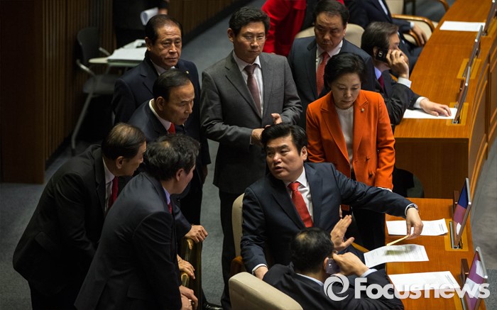 (서울=포커스뉴스) 23일 오후 서울 여의도 국회 본회의장에서 김광진 더불어민주당 의원이테러방지법 본회의 의결을 막기 위해 무제한토론을 시작하자 원유철 새누리당 원내대표 등 새누리당 의원들이 대화를 나누고 있다.