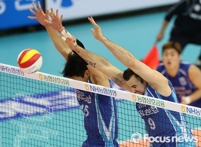 (수원=포커스뉴스) 23일 수원실내체육관에서 열린 '2015-2016NH농협 V-리그' 남자부 한국전력-삼성화재 경기에서 삼성화재 지태환과 그로저가 더블 블로킹으로 한국전력의 공격을 막아내고 있다.