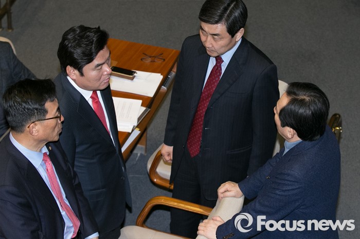(서울=포커스뉴스) 원유철(왼쪽 두번째) 새누리당 원내대표가 23일 오후 서울 여의도 국회 본회의장에서 이종걸(오른쪽 두번째) 더불어민주당 원내대표와 대화하고 있다.