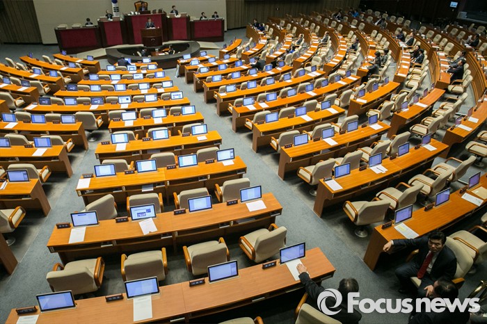 (서울=포커스뉴스) 김무성(앞줄 왼쪽) 새누리당 대표와 원유철(앞줄 오른쪽) 원내대표가 23일 오후 서울 여의도 국회 본회의장에서 테러방지법과 관련해 김광진 더민주 의원이 무제한 토론을 하는 동안 논의하고 있다.