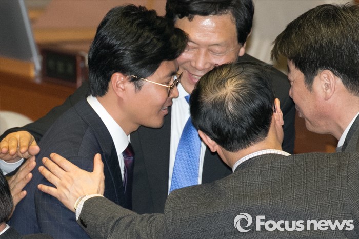(서울=포커스뉴스) 김광진 더불어민주당 의원이 24일 오전 서울 여의도 국회 본회의에서 테러방지법과 관련해, 무제한 토론을 마친 뒤, 동료의원들의 격려를 받고 있다.