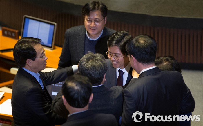 (서울=포커스뉴스) 김광진 더불어민주당 의원이 24일 오전 서울 여의도 국회 본회의에서 테러방지법과 관련해, 5시간 33분간 이어진 무제한 토론을 마친 뒤, 동료 의원들의 격려를 받으며 퇴장하고 있다. 23일 오후 7시 6분에 시작한 김 의원의 무제한토론(필리버스터)는 24일 오전 새벽 12시 39분에 끝나 고(故) 김대중 전 대통령이 1964년 4월 20일에 세운 국회 본회의 최장 발언 기록(5시간 19분)을 뛰어 넘었다.
