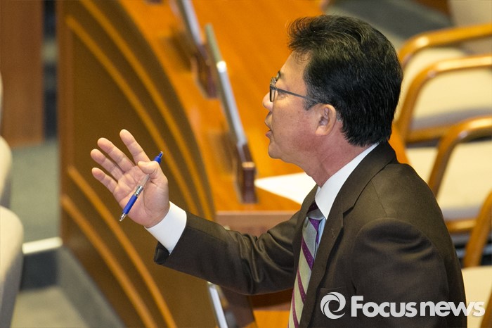 (서울=포커스뉴스) 홍철호 새누리당 의원이 24일 오전 서울 여의도 국회 본회의장에서 테러방지법과 관련해, 은수미 더불어민주당 의원의 무제한 토론 내용에 대해 이의를 제기하고 있다.