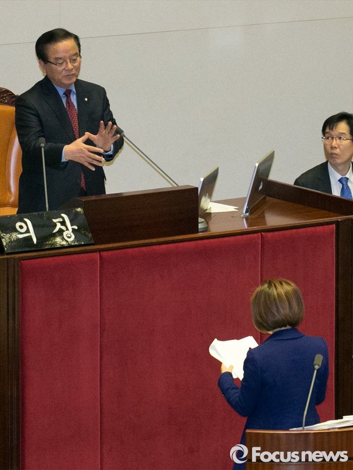 (서울=포커스뉴스) 은수미(앞) 더불어민주당 의원이 24일 오전 서울 여의도 국회 본회의장에서 테러방지법과 관련해, 무제한 토론을 하는 동안, 정갑윤(뒷줄 왼쪽) 부의장이 연설 주제에 대해 지적하고 있다.