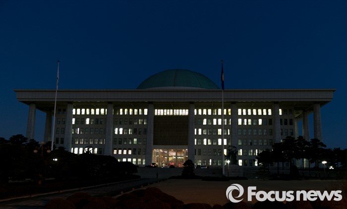(서울=포커스뉴스) 정의화 국회의장의 테러방지법 직권상정에 반발해 시작된 야당의 '무제한 토론(필리버스터)'가 이어지고 있는 24일 새벽 서울 여의도 국회 본청이 환하게 빛나고 있다.