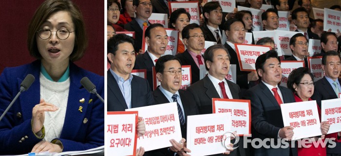새누리당 의원들은 "국민 안전을 외면하는 야당은 각성하라" "테러방지법 처리는 국민의 요구이다" "야당은 국회법 마비사태, 국가 비상사태를 초래한다" 등의 구호를 외치며 강하게 반발했다.