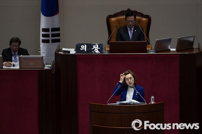 (서울=포커스뉴스) 더불어민주당 김광진 의원의 5시간32분을 깨고, 7시간째 필리버스터를 이어가고 있는 두 번째 필리버스터 주자 은수미 더불어민주당 의원이 24일 오전 서울 여의도 국회 본회의장에서 테러방지법과 관련해 무제한 토론을 하고 있다.
