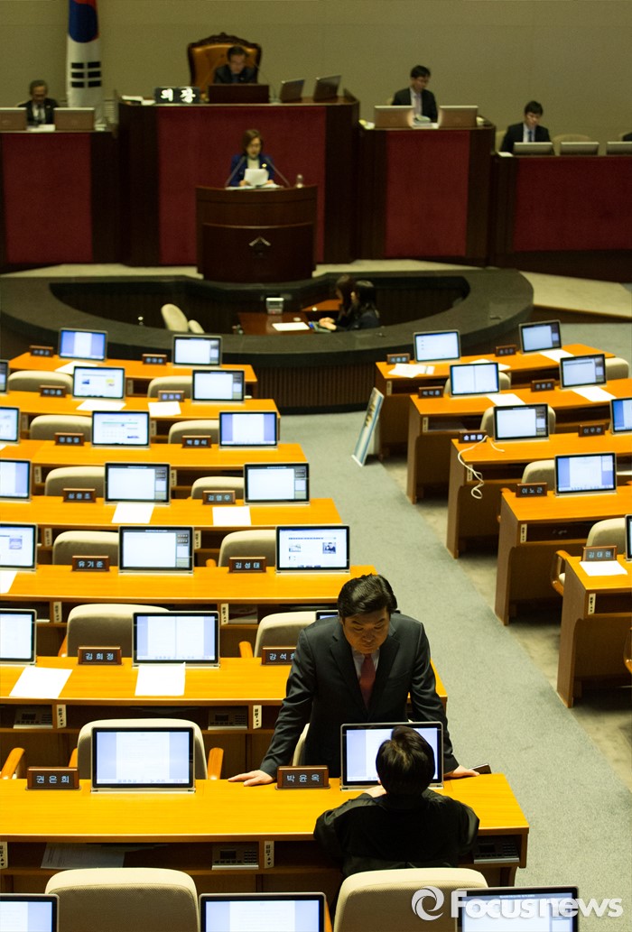 (서울=포커스뉴스) 24일 오전 서울 여의도 국회에서 은수미 더불어민주당 의원이 테러방지법과 관련해 무제한 토론을 이어가고 있다. 원유철(아래) 새누리당 원내대표와 박윤옥 간사가 이야기를 나누고 있다.