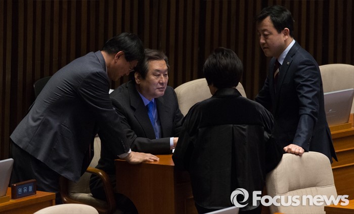 (서울=포커스뉴스) 24일 오전 서울 여의도 국회에서 은수미 더불어민주당 의원이 테러방지법과 관련해 무제한 토론을 이어가고 있다. 김무성 새누리당 대표가 여당 의원들과 대화하고 있다.