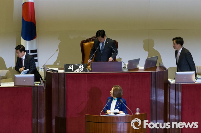 (서울=포커스뉴스) 24일 오전 서울 여의도 국회에서 은수미 더불어민주당 의원이 테러방지법과 관련해 무제한 토론을 이어가던 중 의장석을 교대하는 이석현 국회부의장을 바라보고 있다.