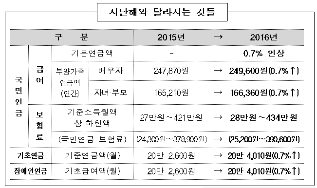 (서울=포커스뉴스) 2016년 4월부터 국민연금과 기초연금 및 장애인연금의 급여액이 0.7% 인상되고, 7월부터 국민연금 보험료의 산정기준인 기준소득월액 하한액은 28만원, 상한액은 434만원으로 상향조정된다.