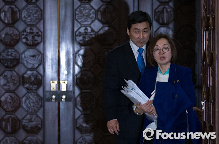 (서울=포커스뉴스) 24일 오후 서울 여의도 국회에서 테러방지법과 관련해 무제한 토론을 마친 은수미(오른쪽) 더불어민주당 의원이 이종걸 원내대표와 본회의장을 나서고 있다.