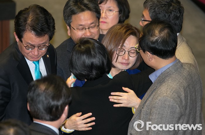 (서울=포커스뉴스) 테러방지법 직권상정에 반발해 야당의 무제한 토론(필리버스터)이 진행되고 있는 24일 오후 서울 여의도 국회 본회의장에서 토론을 마친 은수미 더불어민주당 의원이 동료 의원들의 격려를 받고 있다.