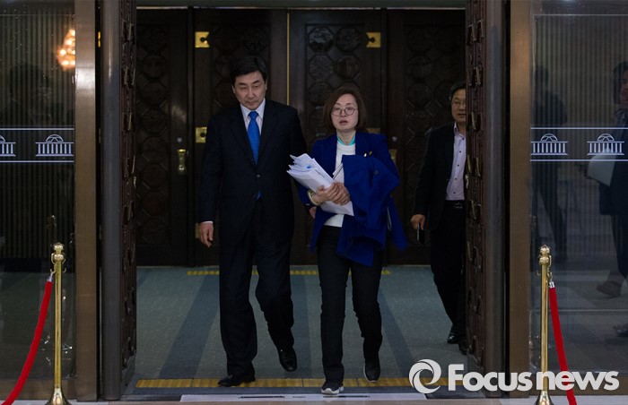(서울=포커스뉴스) 24일 오후 서울 여의도 국회에서 테러방지법과 관련해 무제한 토론을 마친 은수미(오른쪽) 더불어민주당 의원이 이종걸 원내대표와 본회의장을 나서고 있다.