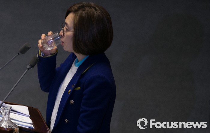 (서울=포커스뉴스) 테러방지법 직권상정에 반발해 야당의 무제한 토론(필리버스터)이 진행되고 있는 24일 오후 서울 여의도 국회 본회의장에서 토론에 참여한 은수미 더불어민주당 의원이 발언 중 물을 마시고 있다. 은 의원은 이날 10시간 18분의 토론을 기록해 국내 최장기록인 10시간 15분을 경신했다.