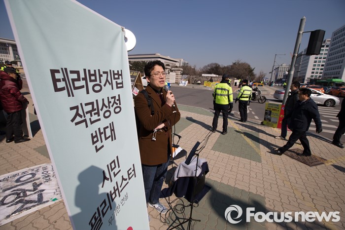 (서울=포커스뉴스) 24일 오후 서울 여의도 국회 정문 앞에서 테러방지법 처리를 반대하는 시민이 필리버스터에 참여해 연설을 하고 있다.
