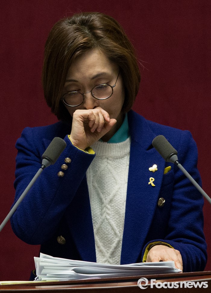 (서울=포커스뉴스) 테러방지법 직권상정에 반발해 야당의 무제한 토론(필리버스터)이 진행되고 있는 24일 오후 서울 여의도 국회 본회의장에서 토론에 참여한 은수미 더불어민주당 의원이 발언 중 눈물짓고 있다. 은 의원은 이날 10시간 18분의 토론을 기록해 국내 최장기록인 10시간 15분을 경신했다.