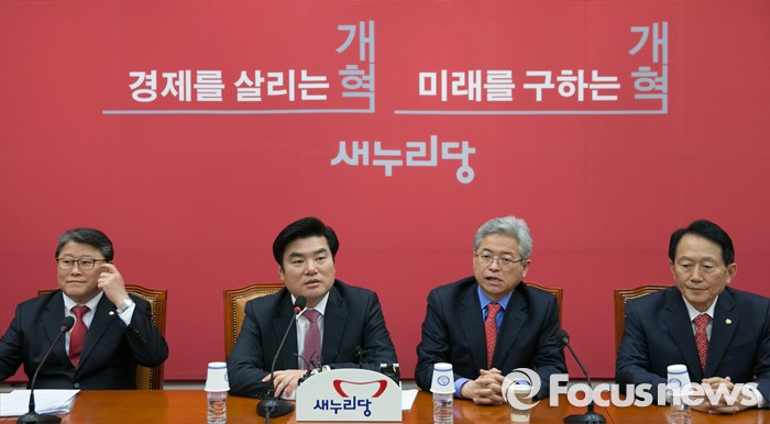 (서울=포커스뉴스) 테러방지법 직권상정에 반발해 야당의 무제한 토론(필리버스터)이 진행되고 있는 24일 오후 서울 여의도 국회에서 열린 새누리당 원내대표단-정보위원회 연석회의에 참석한 원유철 원내대표가 모두발언을 하고 있다. 왼쪽부터 조원진 원내수석부대표, 원 원내대표, 이철우 정보위 여당 간사, 김종태 의원.